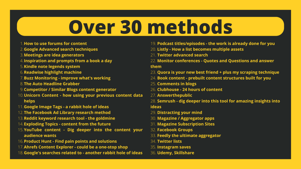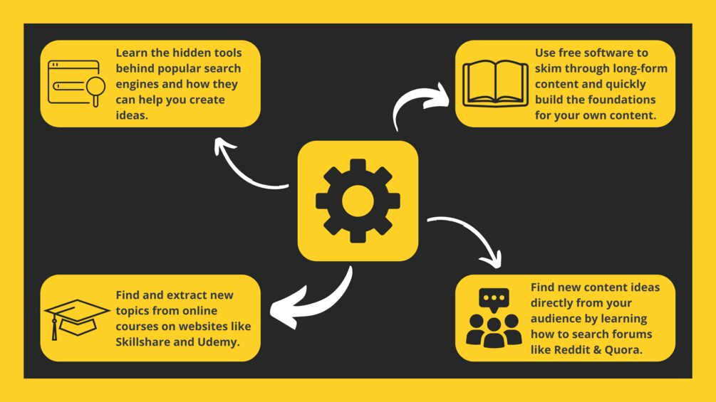 With these methods, you can endlessly create content for various mediums, including; blogs, eBooks, social media posts, online courses and video content.