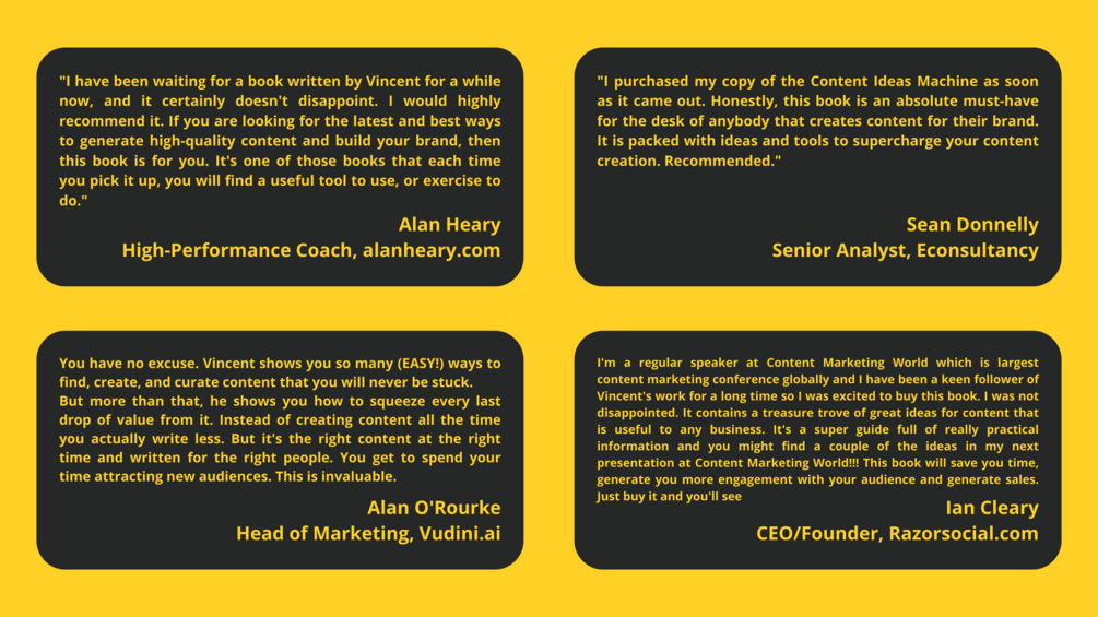 The 'Content Ideas Machine' is designed to INCREASE your content output and quality while DECREASING the amount of time you spend each day creating content.